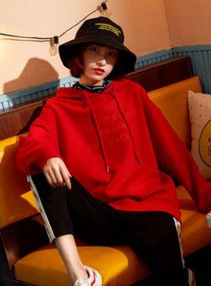 加绒卫衣2018新款女潮长袖加厚韩版宽松连帽卫衣女春秋卫衣女红色