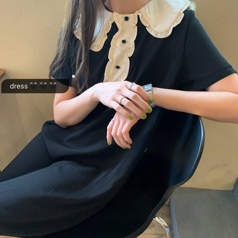 早春秋小众裙子韩系新款温柔风简约气质黑色短袖雪纺连衣裙女