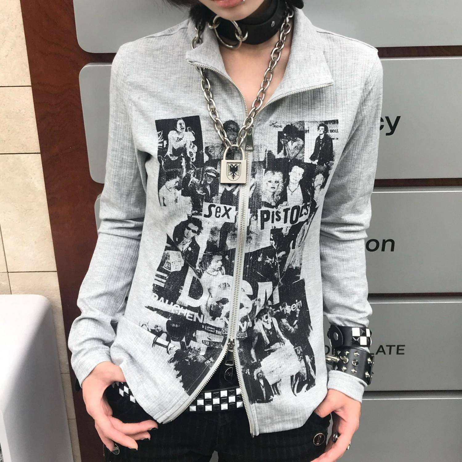 秋系性手枪摇滚乐队vintage印花收腰拉链开衫长袖朋克风直筒男