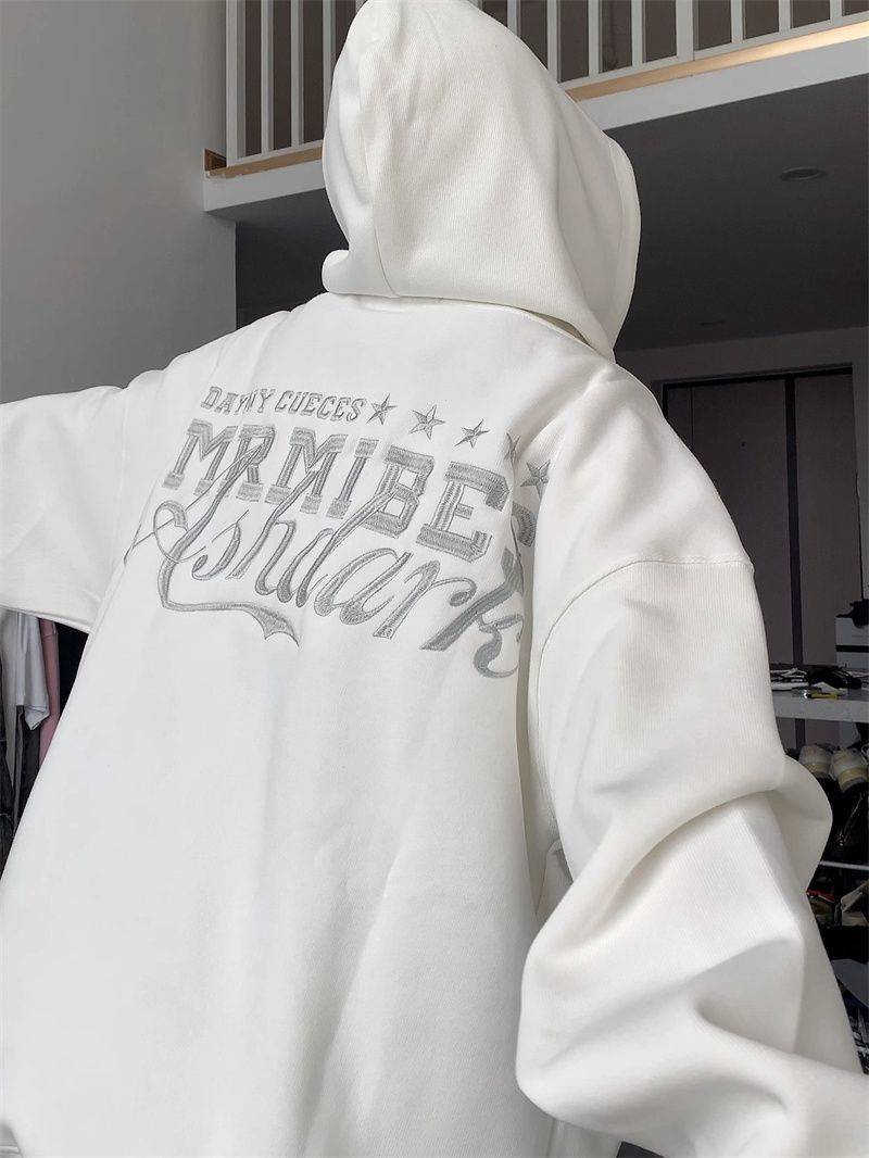 纯棉秋冬季银狐绒美式国潮牌星星重工刺绣连帽卫衣女宽松高街上衣