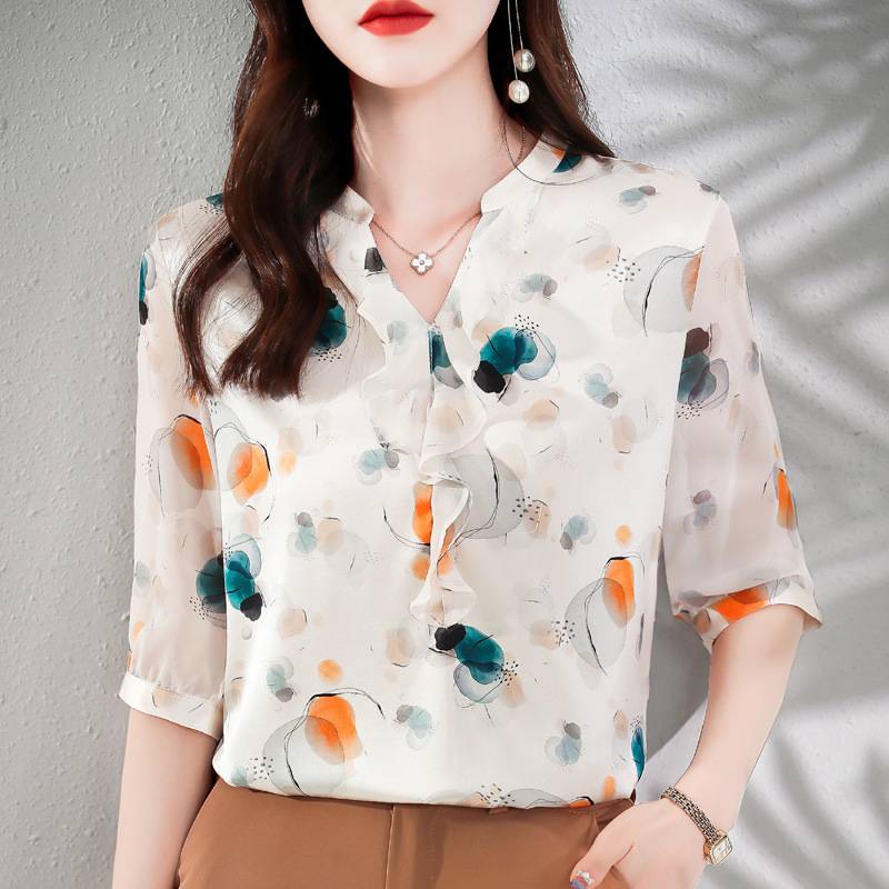 重磅真丝衬衫女2022夏装新款v领衬衣设计感职业OL桑蚕丝上衣
