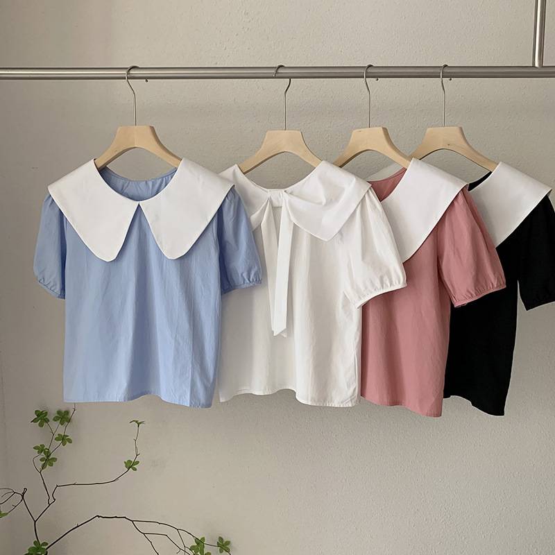 韩系小香风撞色娃娃领衬衫女气质甜美蝴蝶结泡泡短袖上衣