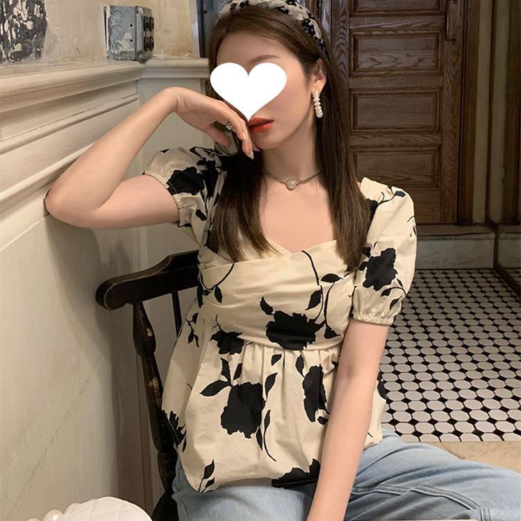 杨 法式复古水墨画印花衬衫女设计感小众显瘦方领上衣短款