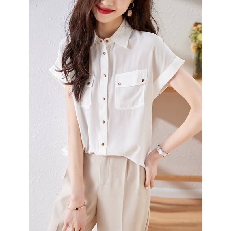 职场简约通勤polo翻领衬衫女2022法式宽松显瘦宽松短袖上衣