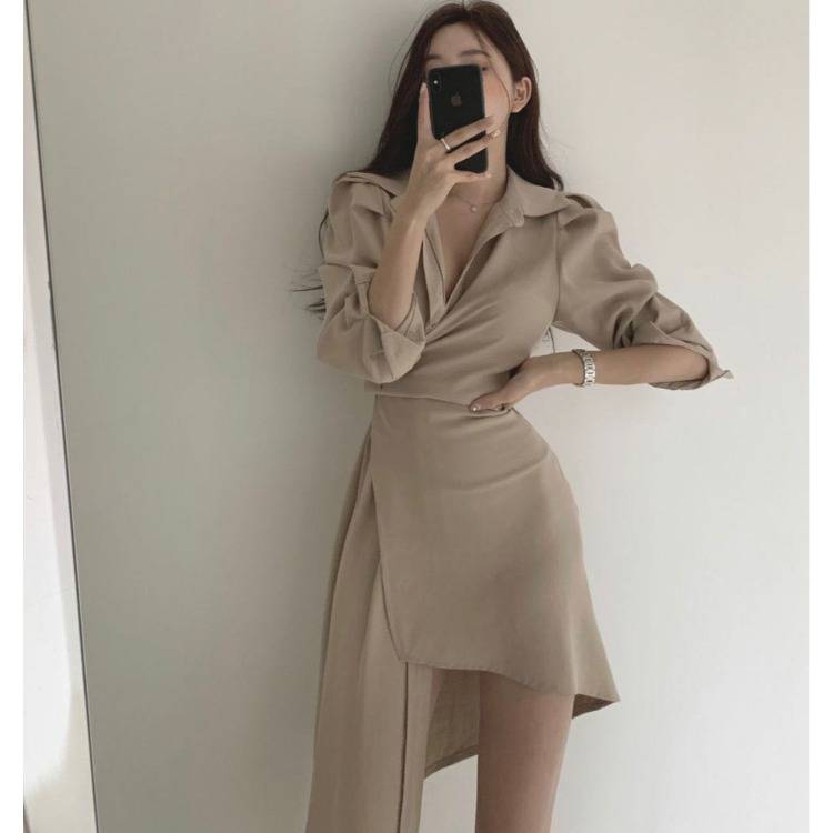 韩国官网chic春季新款法式优雅不规则收腰长袖连衣裙女短裙
