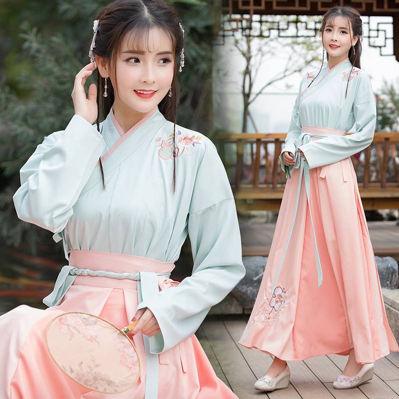 原创2018春季传统汉服女装刺绣交领日常改良襦裙套装
