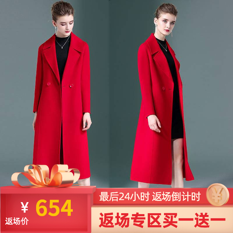 双面羊毛大衣修身长款呢子大衣2019秋冬季女高档红色毛呢外套