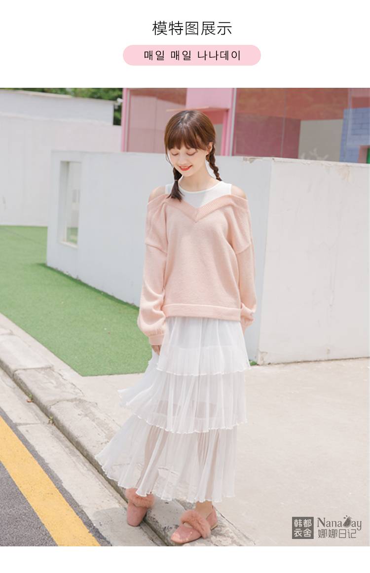 2018秋装新款女装上衣粉色露肩套头宽松长袖毛衣针织衫女