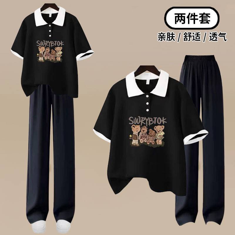 韩版短袖长裤套装夏季宽松纯棉POLO衫T恤 西装阔腿裤少女装两件套