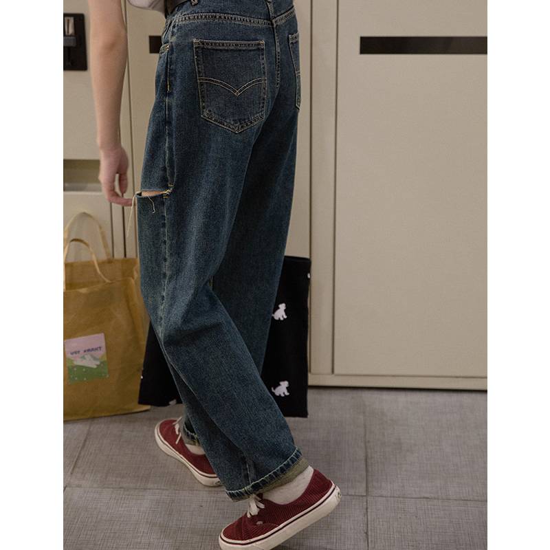 星球破洞牛仔裤女2021新款夏复古日系宽松显高直筒拖地裤薄款兔奶