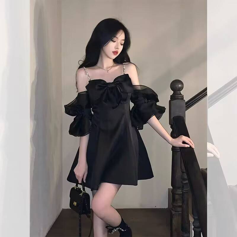 法式一字肩黑色蝴蝶结吊带连衣裙女夏季2023新款高级感裙子