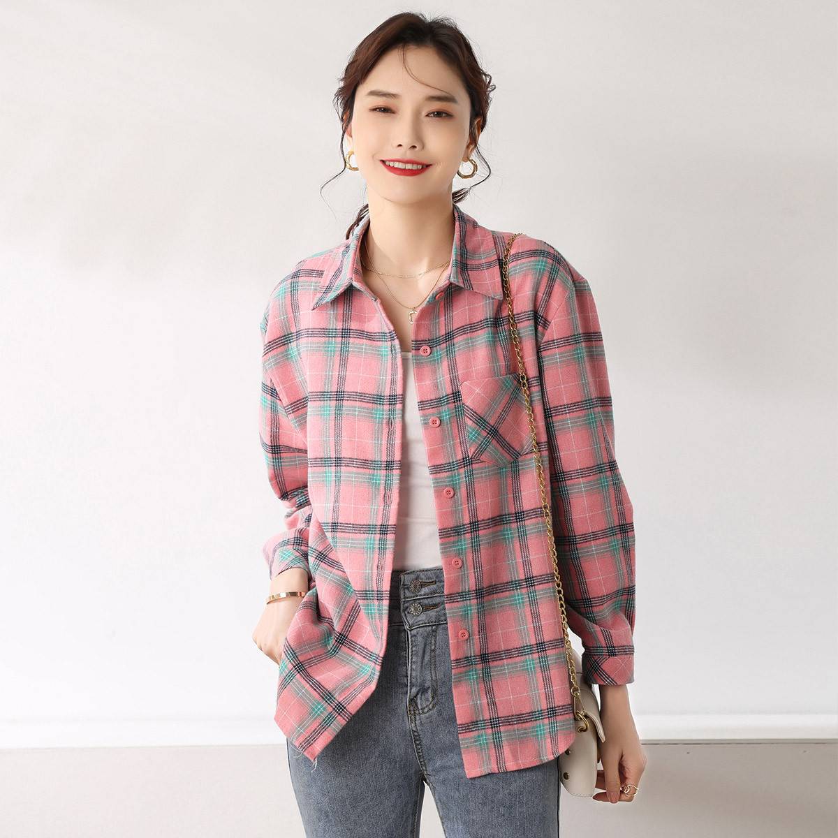 包邮经典百搭棉质格纹宽松休闲女式泡泡袖长袖衬衫上衣