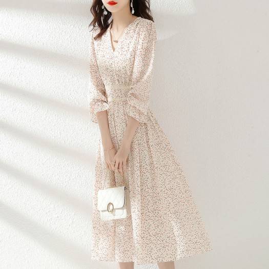包邮2021夏季新款港风chicV领碎花中长A字休闲连衣裙女