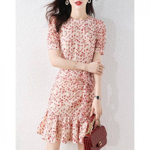 包邮2021夏季新品圆领碎花连衣裙不规则褶皱鱼尾裙女
